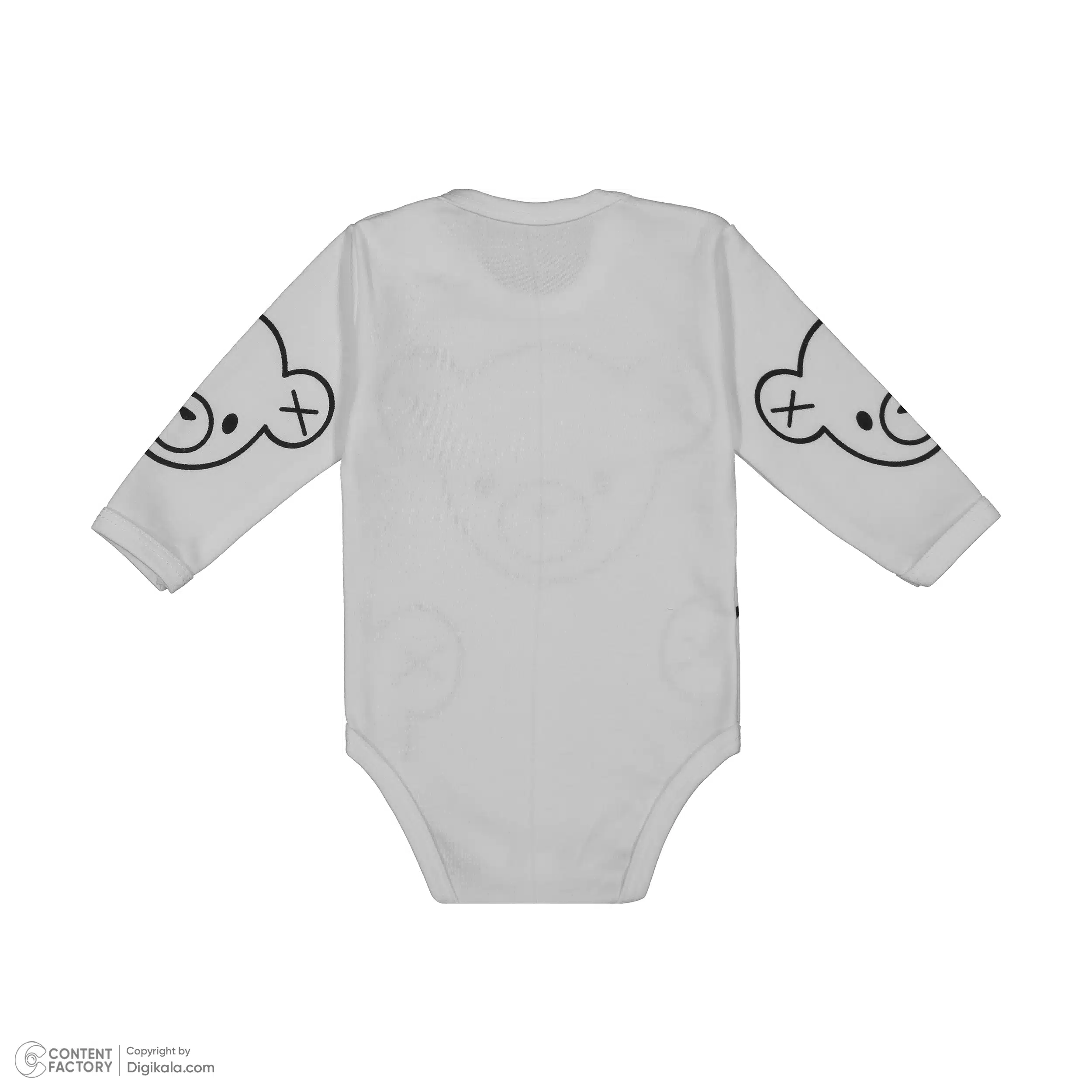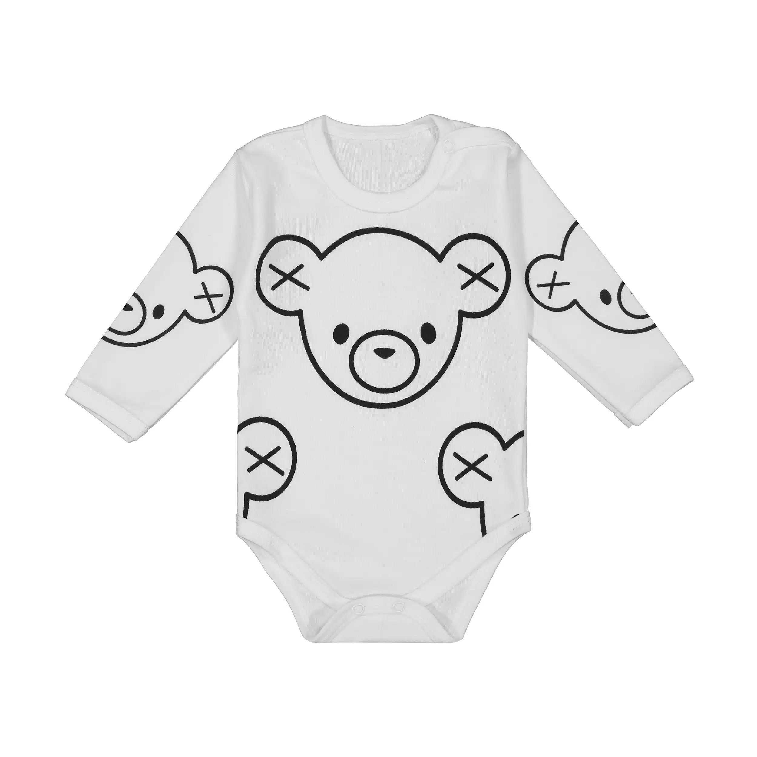 طرح خرسهای کارتونی بزرگ با خطوط مشکی روی زمینه سفید، ظاهری کودکانه و دوستداشتنی به این بادی میبخشند. چشمهای ضربدری خرسها در کنار طراحی ساده، لباس را به انتخابی خاص و متفاوت تبدیل کردهاند که استایل نوزاد شما را جذابتر میکند.