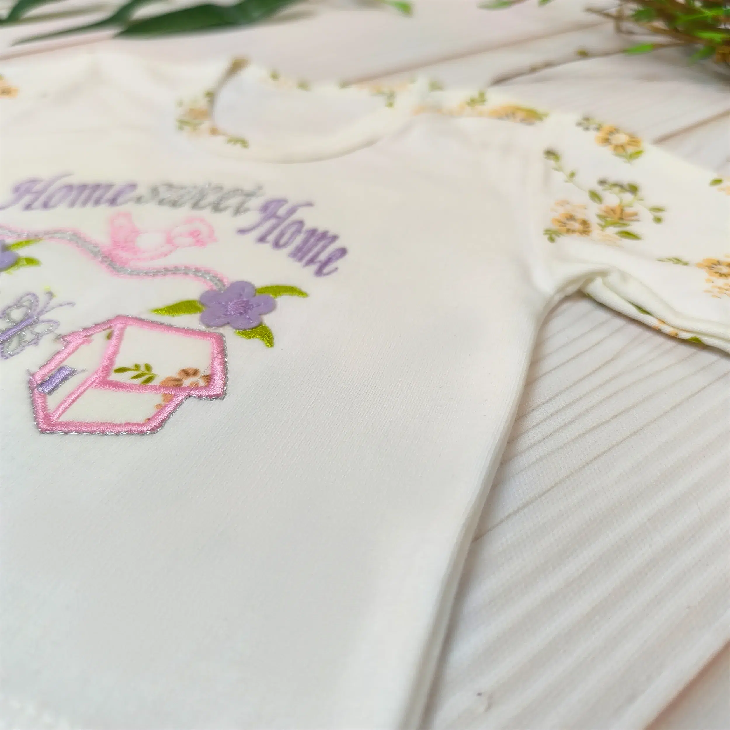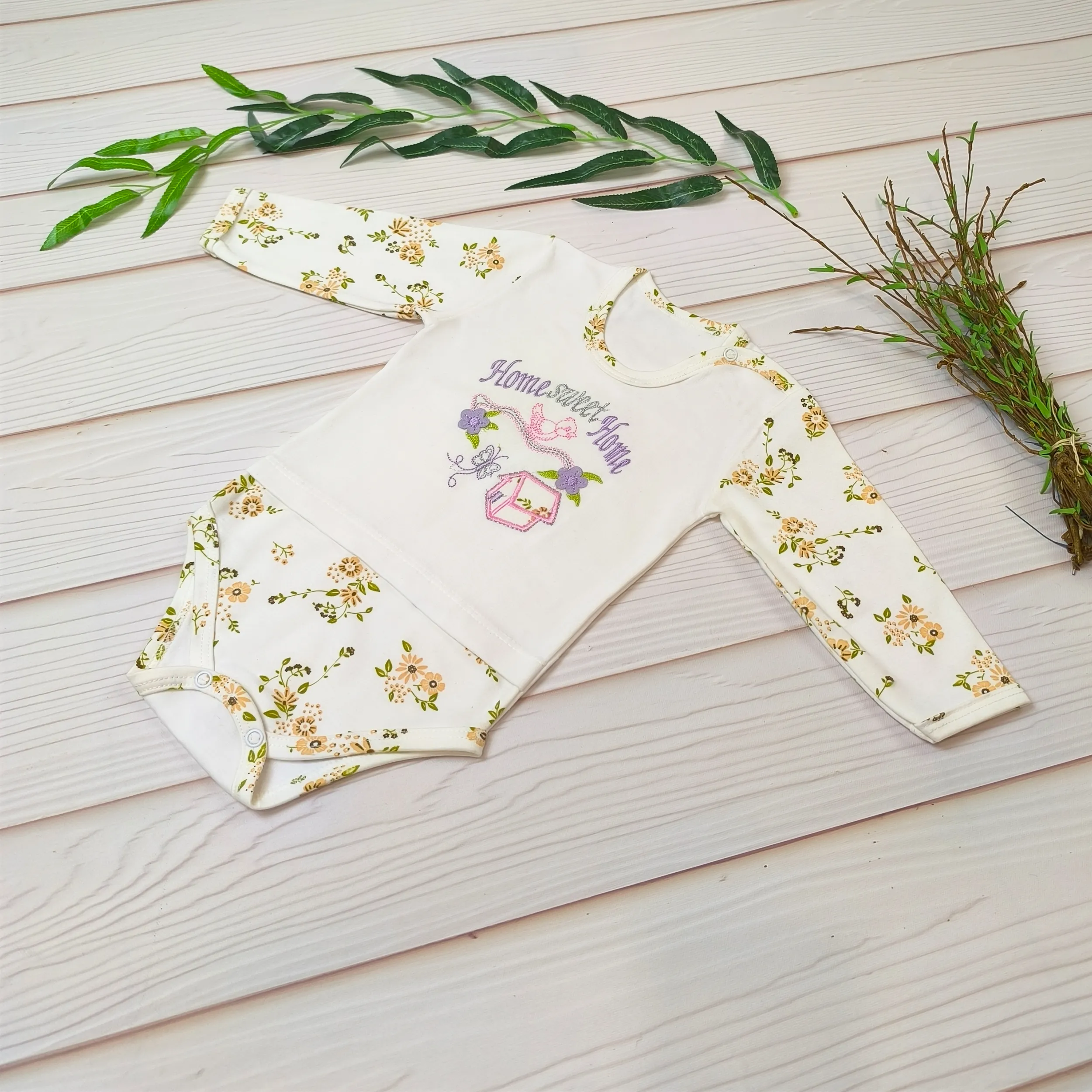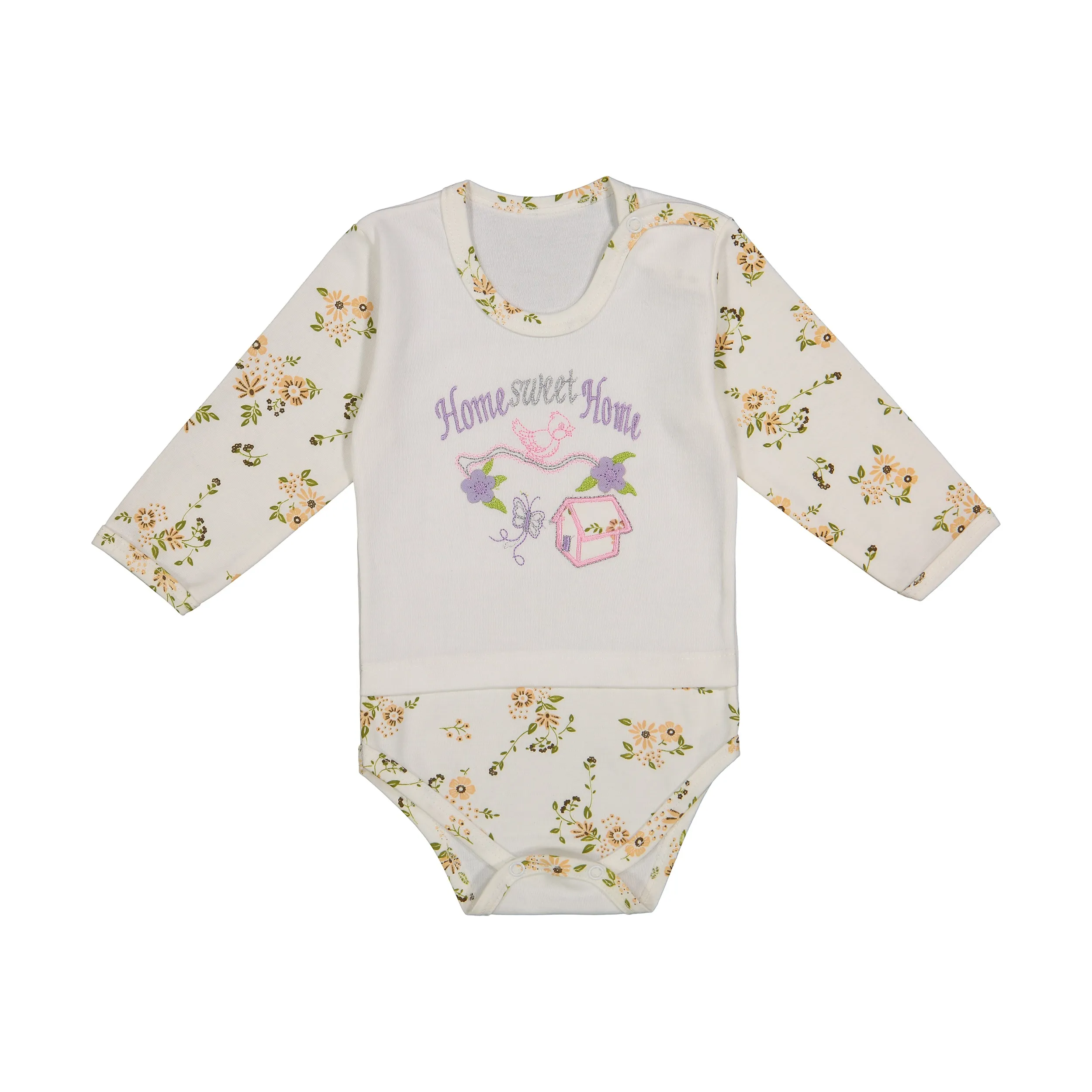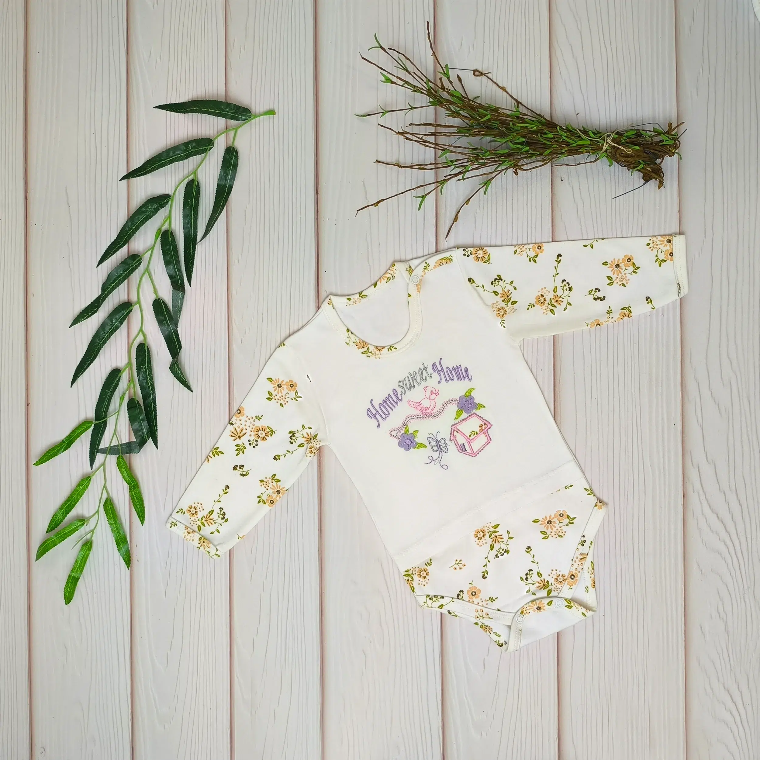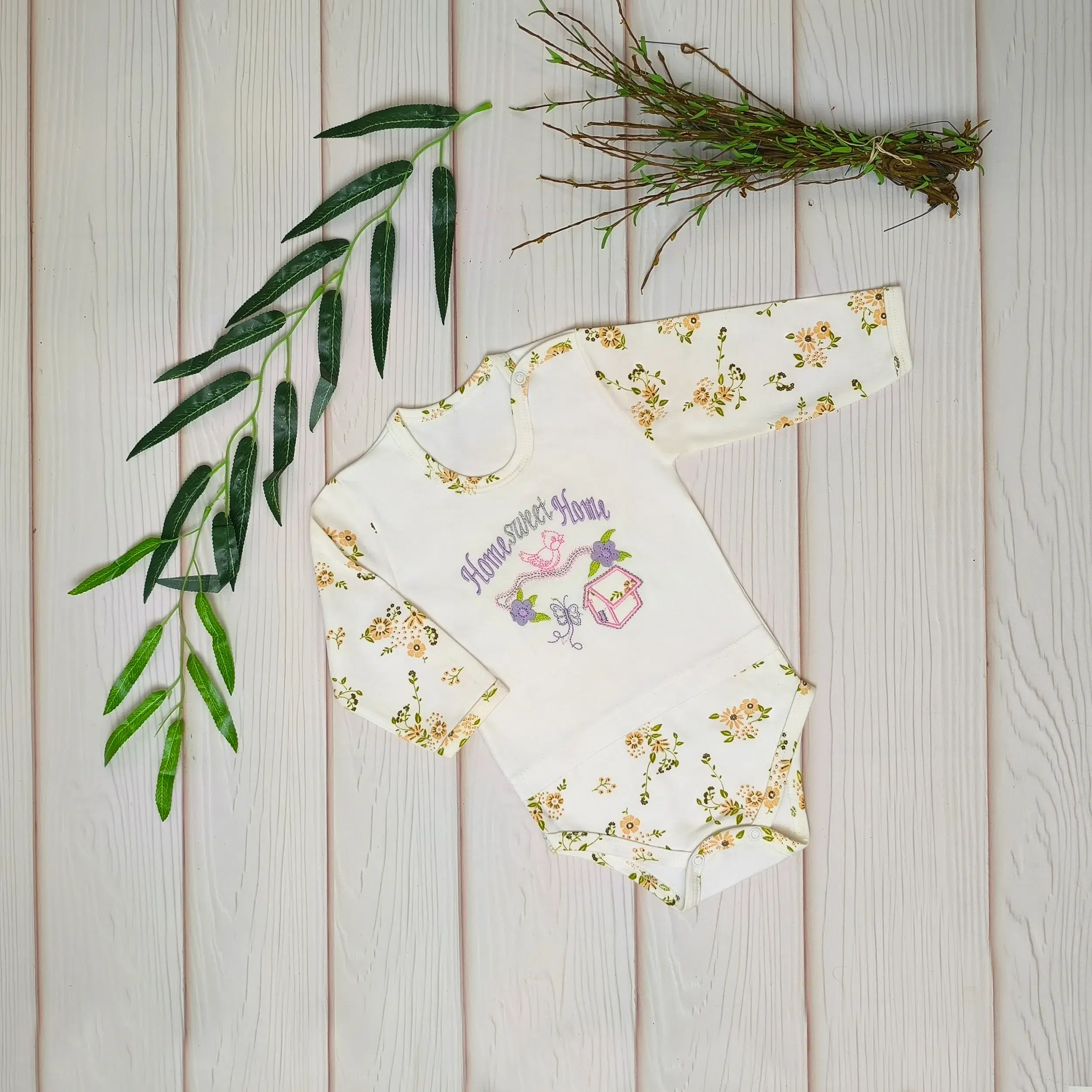 طرح گل‌دار زیبا همراه با تصویر خانه و گنجشک روی قسمت جلوی لباس، این بادی را به یک لباس شیک و کودکانه تبدیل کرده است. رنگ‌های ملایم و طراحی خاص آن به راحتی با دیگر لباس‌های نوزاد هماهنگ می‌شوند و استایلی جذاب به او می‌بخشند. دکمه‌های فشاری در قسمت زیرین لباس تعویض پوشک را برای والدین بسیار آسان می‌کنند. طراحی یقه‌ی گرد و آستین‌های بلند، پوشیدن و درآوردن این بادی را بدون هیچ زحمتی ممکن می‌سازد و راحتی بیشتری برای نوزاد فراهم می‌کند. والدین می‌توانند این بادی را به راحتی به صورت دستی یا با ماشین لباسشویی بشویند. پارچه‌ی باکیفیت و دوخت دقیق، دوام لباس را تضمین می‌کنند و باعث می‌شوند حتی پس از شست‌وشوهای مکرر، ظاهر و کیفیت آن حفظ شود.