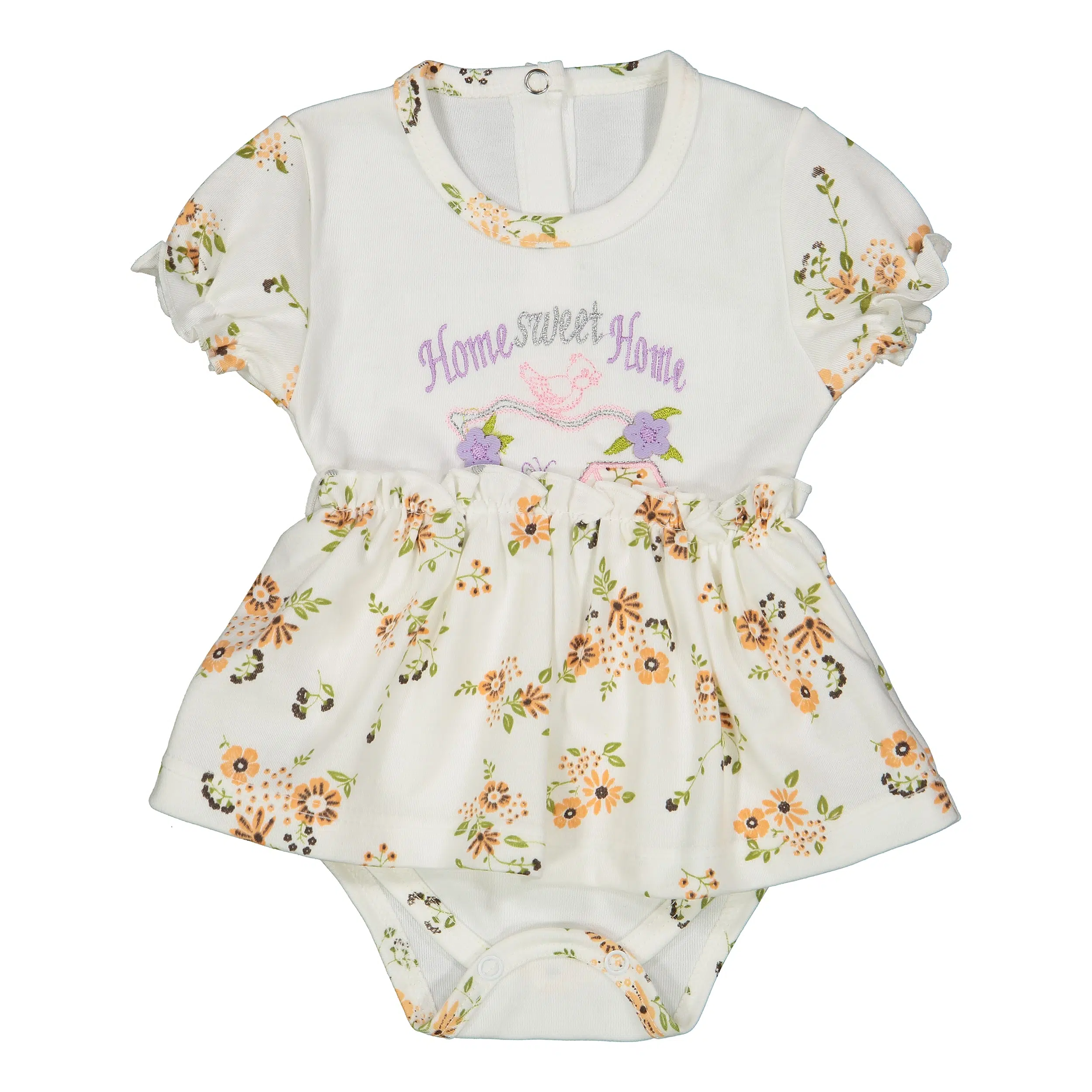 با بادی نوزادی دخترانه طرح گنجشک، استایل شیک و راحتی را برای کوچولوی خود فراهم کنید. این بادی پیراهنی زیبا با طرح گلدار و گلدوزی “Home Sweet Home” طراحی شده است تا جذابیت خاصی به ظاهر نوزاد شما بدهد.