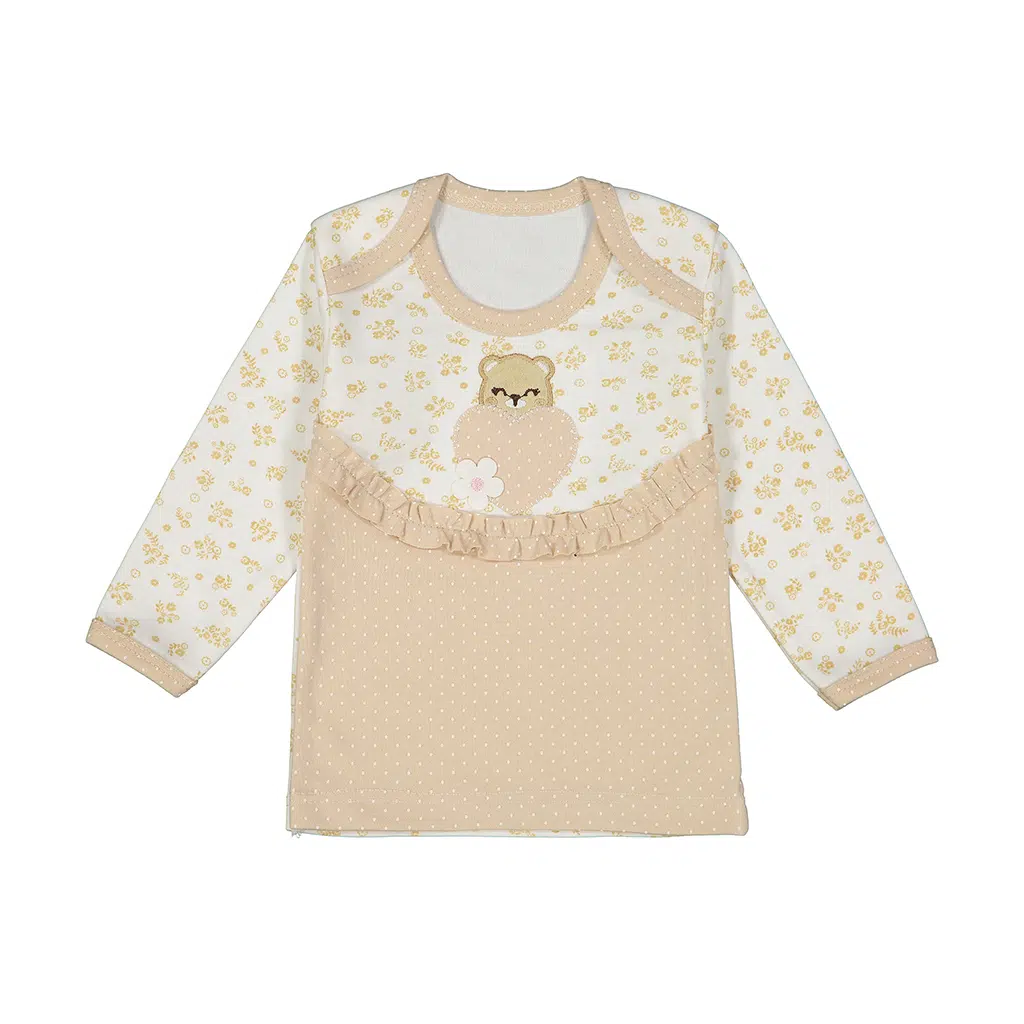 تولیدی بیبی ست این رنگبندی سفید و کرم را در سال ۱۴۰۴ بهعنوان ترند اصلی لباس نوزادی مطرح کرده است. این بلوز یکی از پرفروش ترین طرح ها بوده و در کنار طرح گلریز و گلدوزی خرسی، فوراً چشم را میگیرد. با یقه گرد، تعویض لباس را در به راحتی انجام میدهد و دوخت تمیز و بادوام لباس هم کاری میکند که حتی بعد از شستشوهای مکرر، همان کیفیت و زیبایی روز اول را حفظ کند.