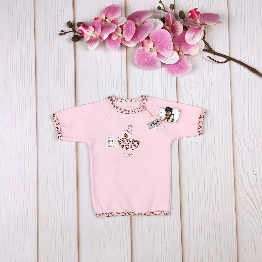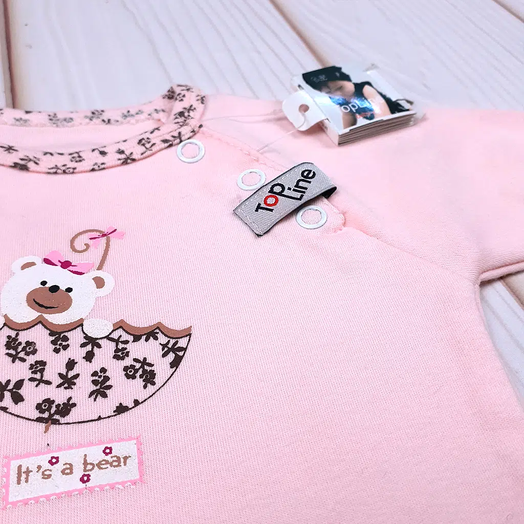 تیشرت صورتی با طرح خرس و چتر، ظاهر لباس را کودکانه و دوست‌داشتنی می‌کند. لبه‌دوزی گلدار روی یقه و آستین‌ها، ست را زیباتر کرده است.