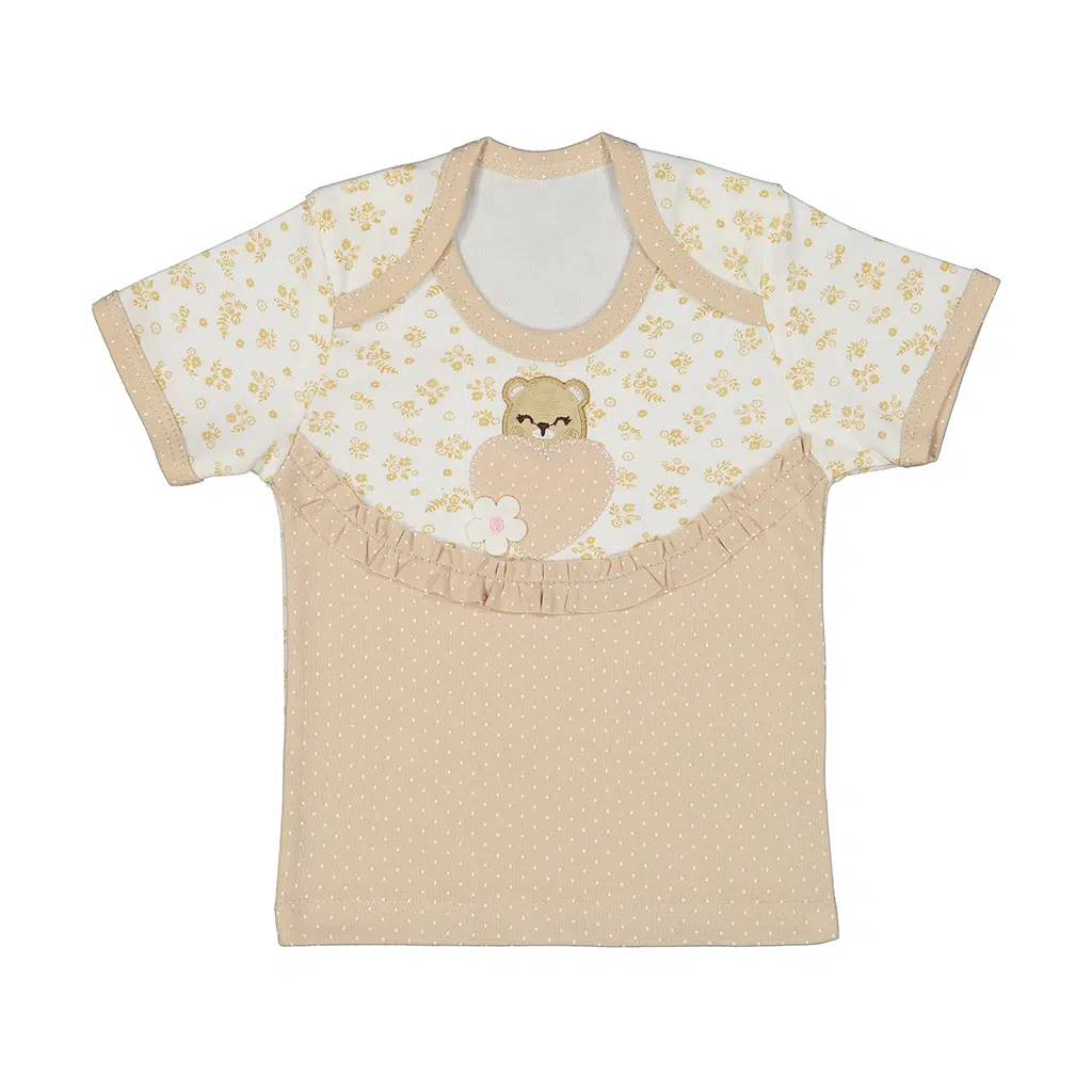 تیشرت نوزاد دخترانه طرح گلریز یکی از شیک‌ترین و ترندترین انتخاب‌های سال برای نوزادان است. این تیشرت با ترکیب رنگ‌های کرم و سفید که جزو محبوب‌ترین رنگ‌های لباس نوزادی هستند، ظاهر فوق‌العاده لطیف و دوست‌داشتنی ایجاد می‌کند. طرح گلریز همراه با گلدوزی خرس، آن را به گزینه‌ای ایده‌آل برای والدینی تبدیل کرده که به دنبال زیبایی، کیفیت و راحتی در کنار هم هستند.