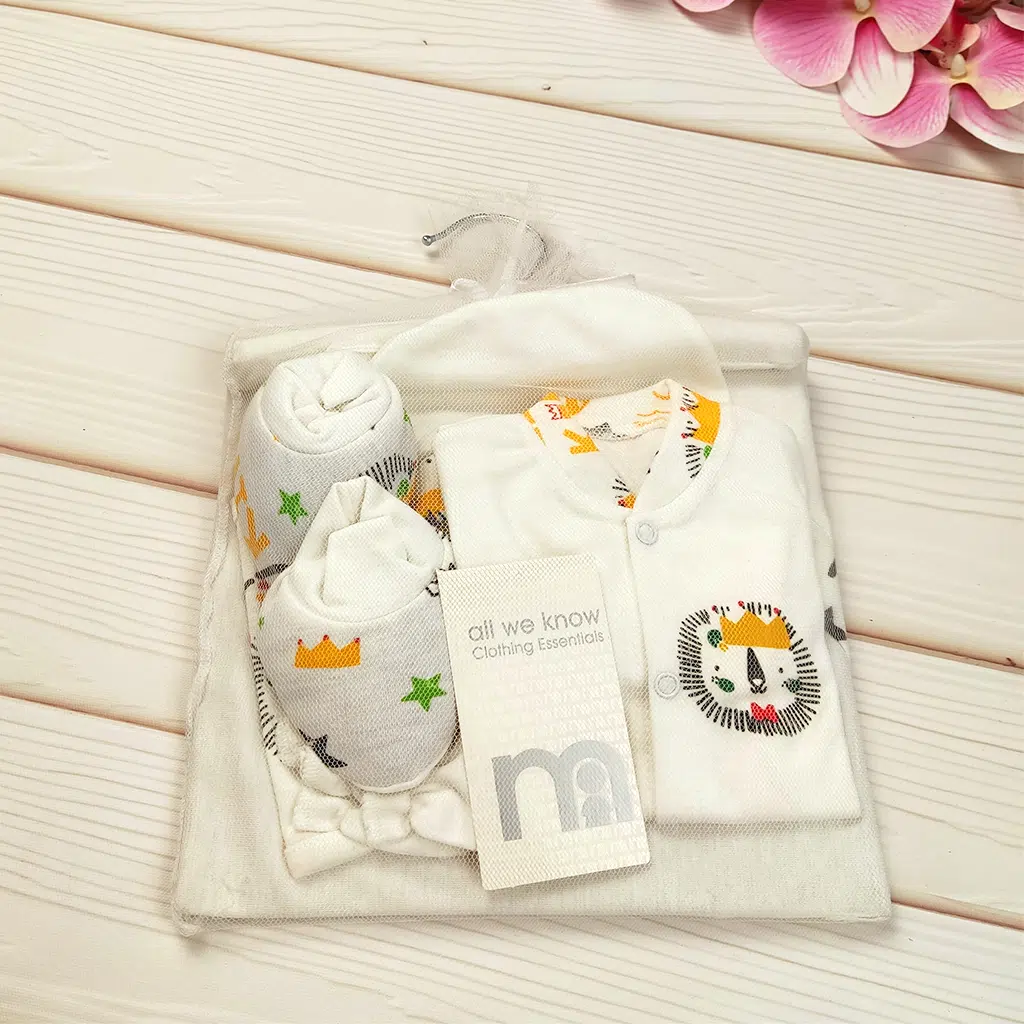 ست 7 تکه بیمارستانی نوزادی مادرکر (Mothercare) طرح شیر با ترکیب رنگ سفید و چاپهای شاد کودکانه، یکی از پرطرفدارترین انتخابها برای نوزادان بدو تولد تا سهماهگی است. این مجموعه با طراحی خنثی و دوستداشتنی، هم برای نوزاد دختر و هم برای نوزاد پسر مناسب است.