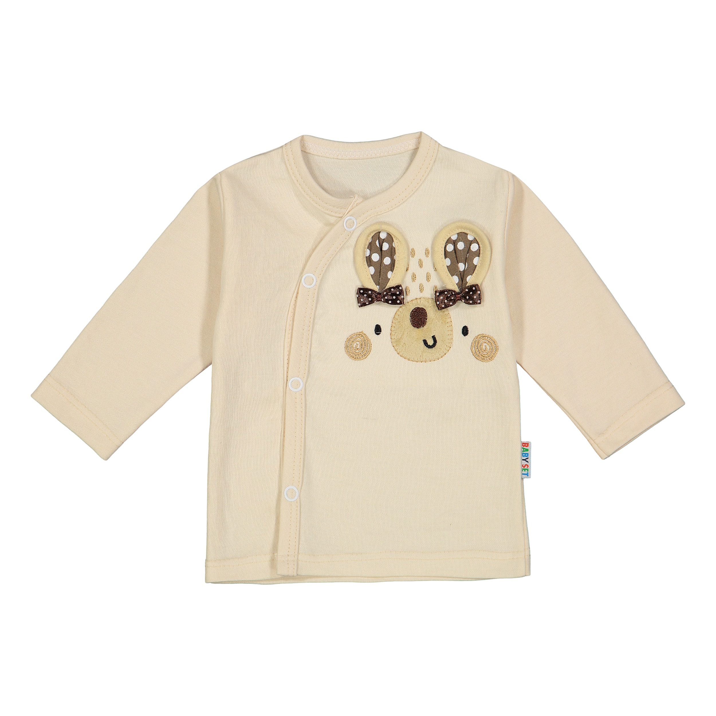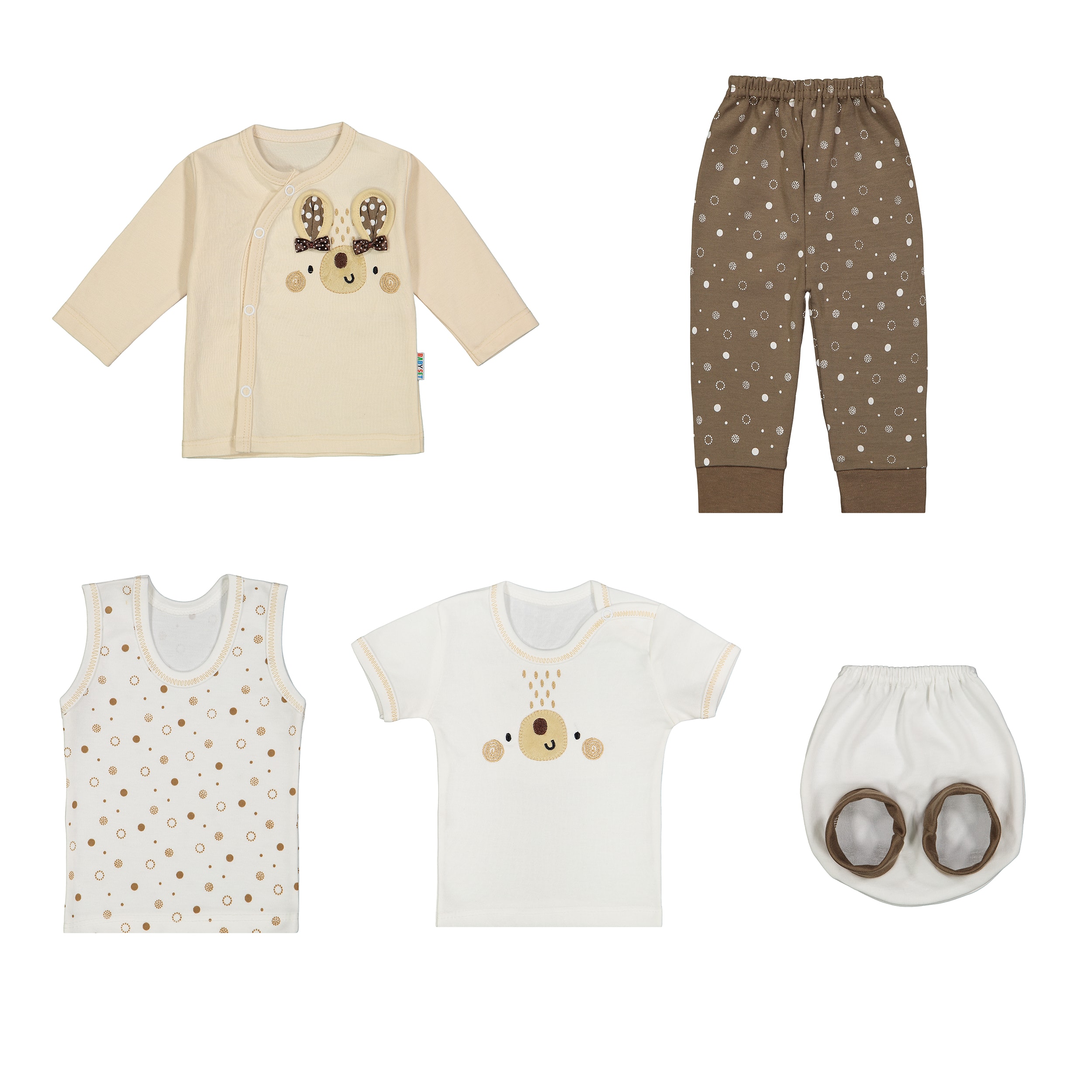ست نوزادی ۵ تکه بیبی ست مدل گوشدار کرم، یک انتخاب کاربردی و جذاب برای تکمیل سیسمونی نوزاد شماست. این ست با رنگهای آرامشبخش کرم و قهوهای روشن و طرح کودکانه فیل خندان، ظاهری دلنشین و مینیمال دارد که بهراحتی با سایر لباسها و لوازم نوزادی هماهنگ میشود.