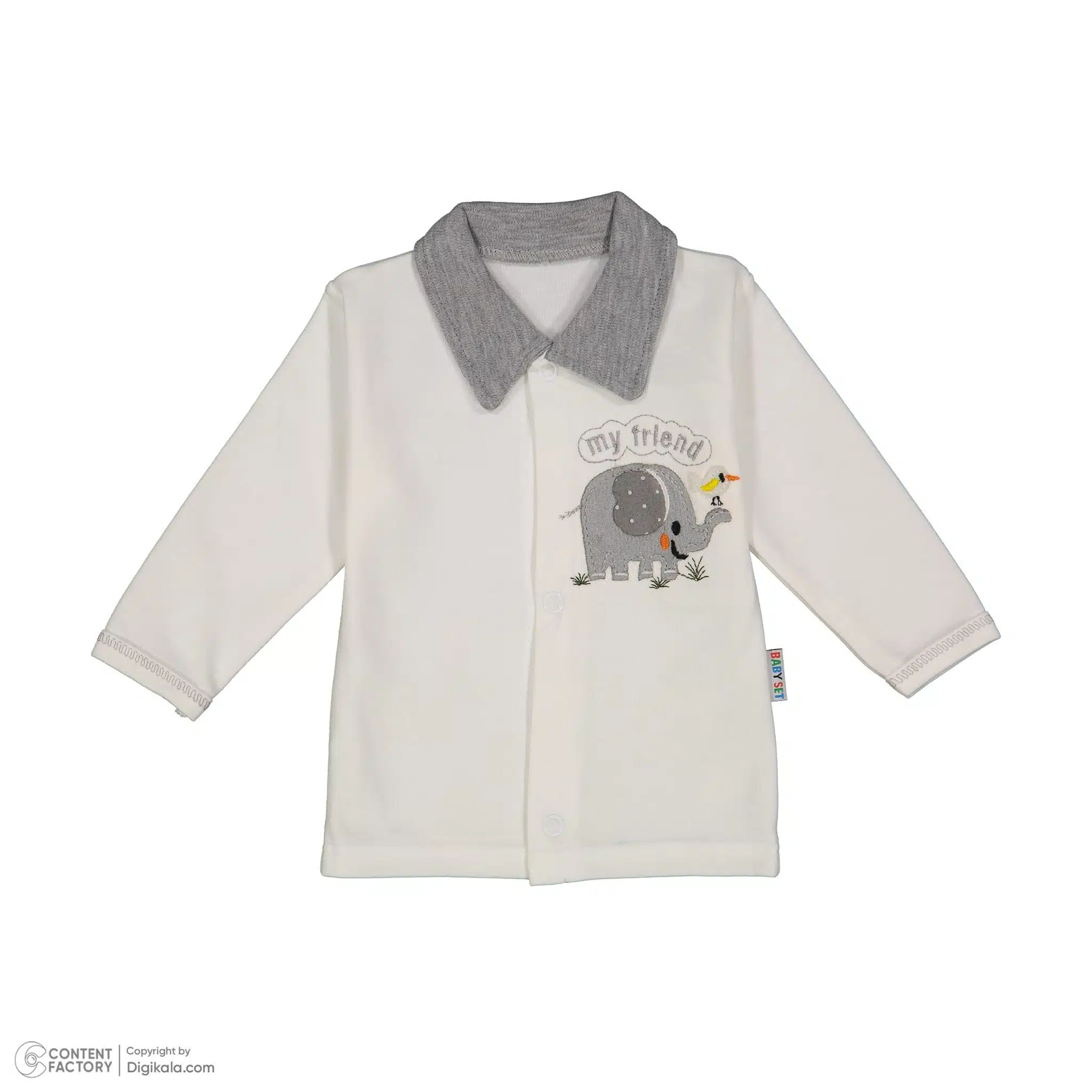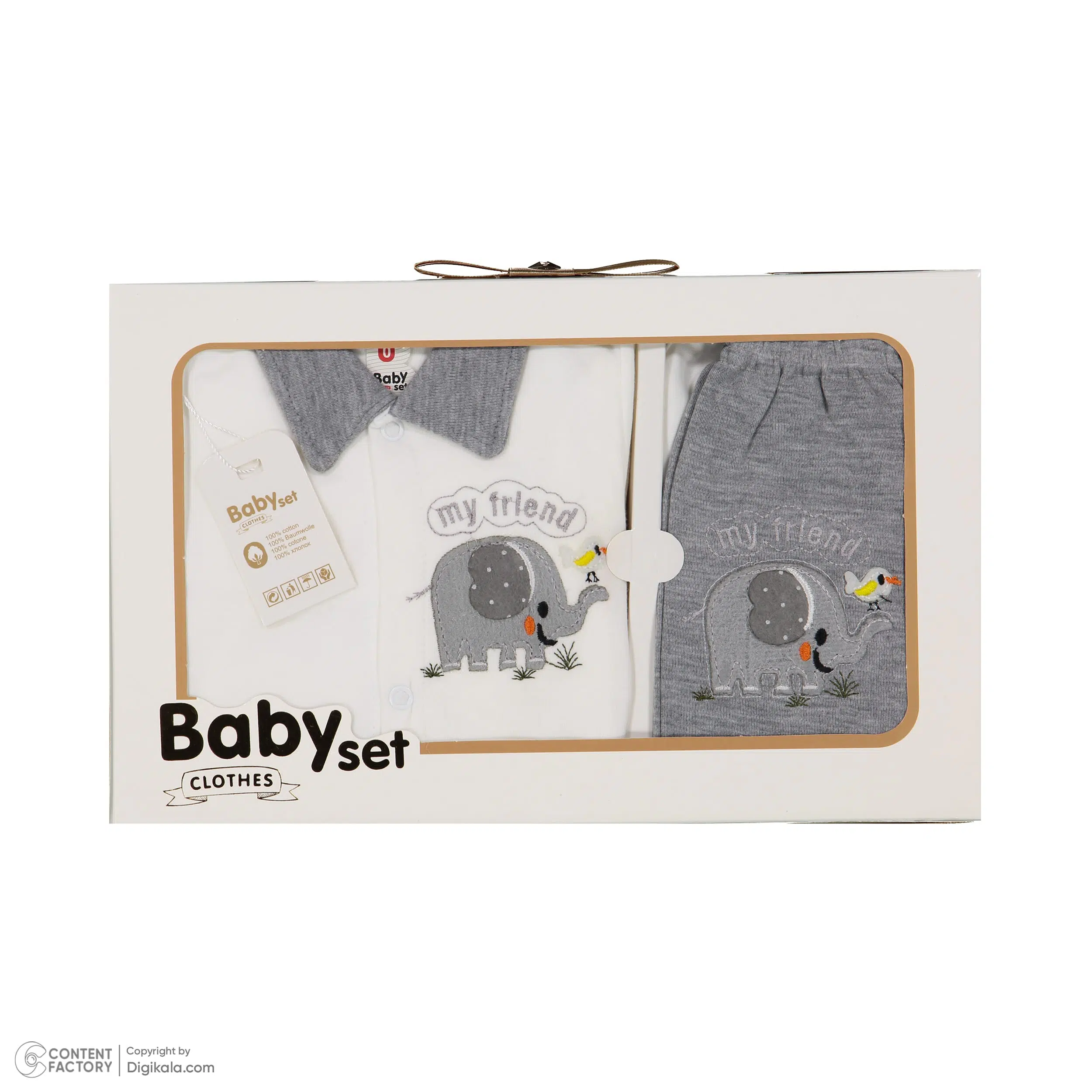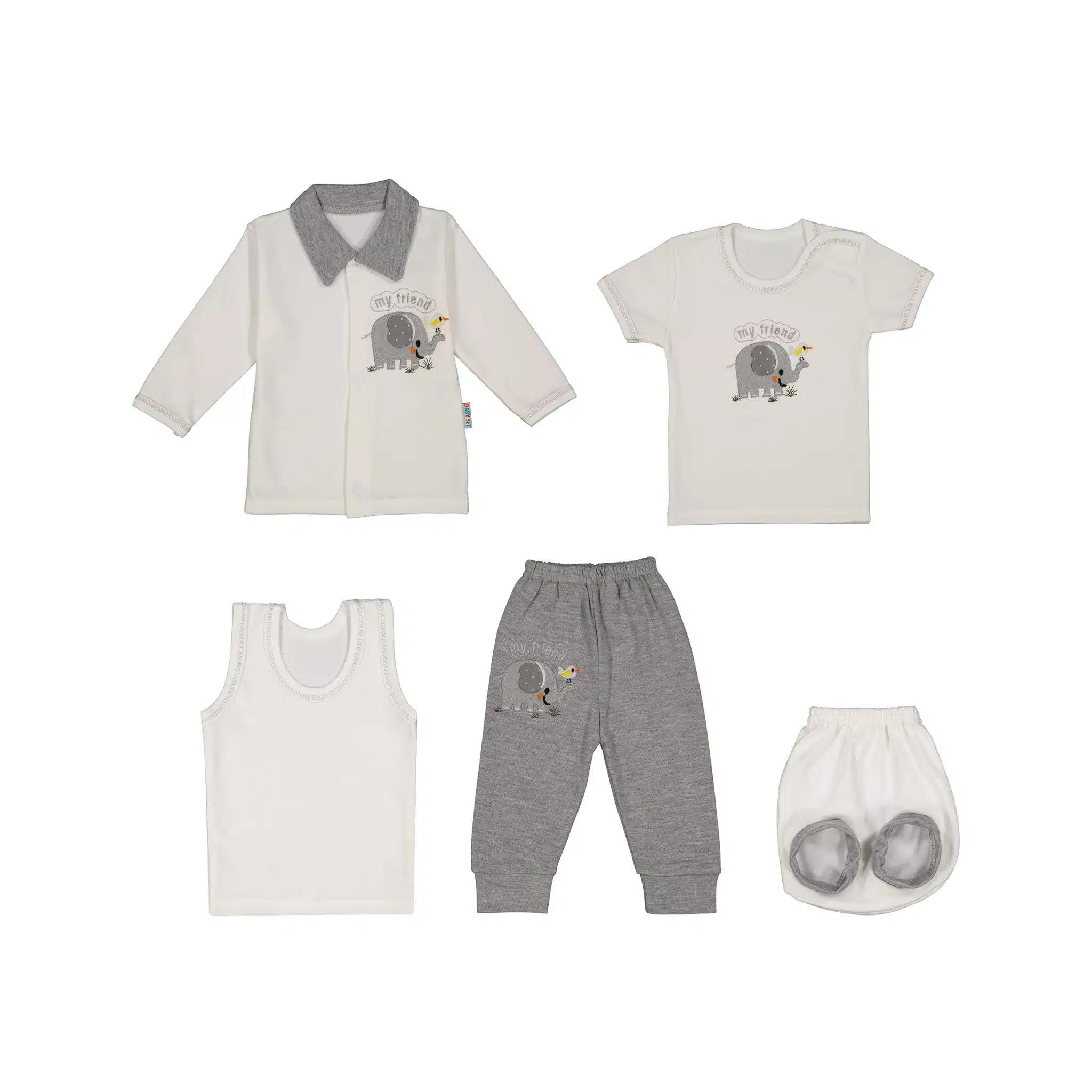 ست نوزادی 5 تکه طرح فیل – طوسی و سفید | راحتی و زیبایی برای نوزاد شما