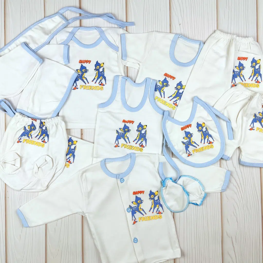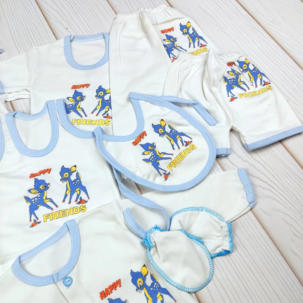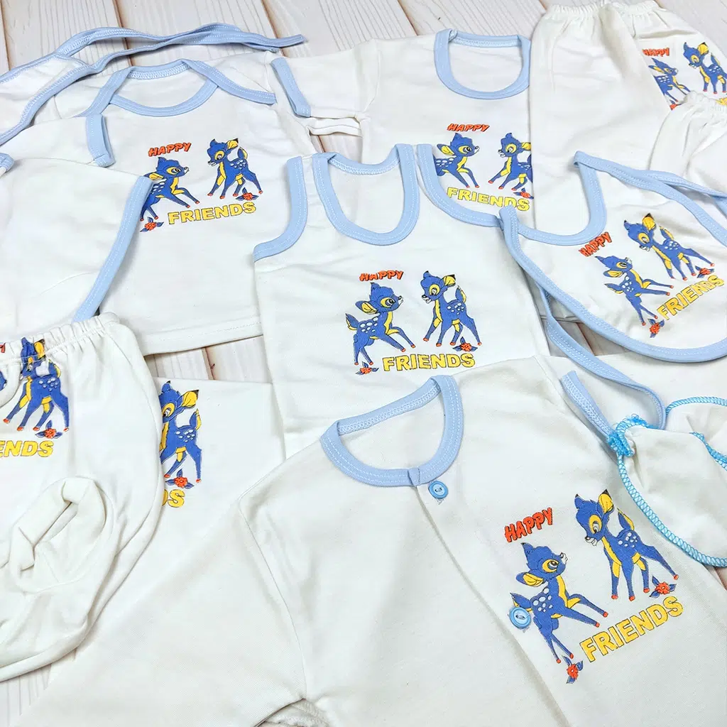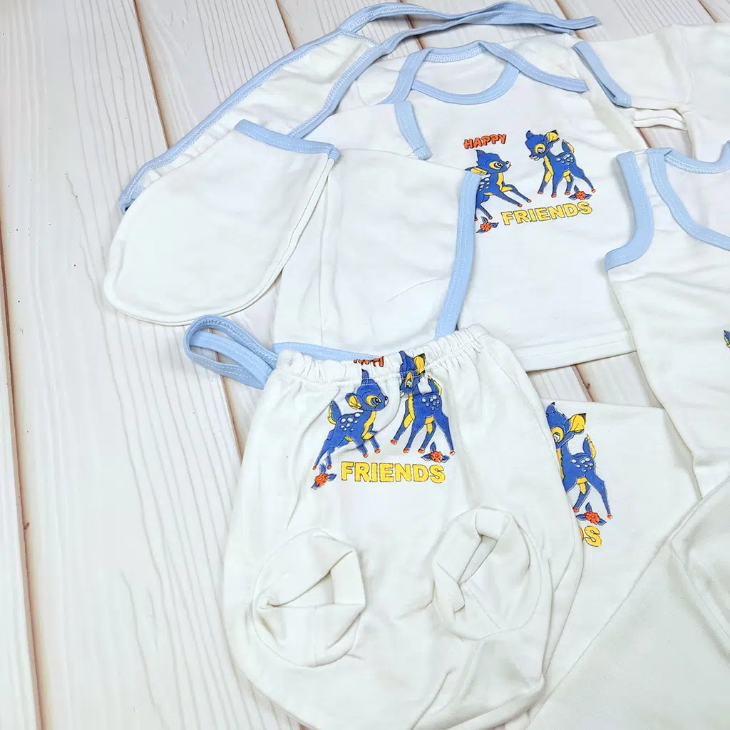 این ست ۱۴ تکه نوزادی طرح Happy Friends یکی از کاملترین و اقتصادیترین انتخابها برای سیسمونی است. رنگبندی کرم با دوردوزی آبی روشن، ظاهر ست را بسیار لطیف و مناسب نوزادان کرده است. طرح گلدوزیشده «دوستای کوچک» روی تمام قطعات، ست را هماهنگ، شیک و کودکانه میکند.