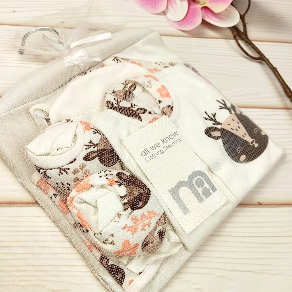 ست ۷ تکه بیمارستانی نوزادی مادرکر (Mothercare) طرح گوزن، با طراحی خاص و رنگهای طبیعی، انتخابی شیک و آرام برای نوزادان بدو تولد تا سهماهگی است. پارچهی این ست از پنبه مرغوب و باکیفیت بالا دوخته شده تا در تماس با پوست لطیف نوزاد، احساس نرمی و راحتی ایجاد کند. طرح فانتزی گوزن، ظاهر لباس را لطیف، طبیعی و دلنشین کرده است.
