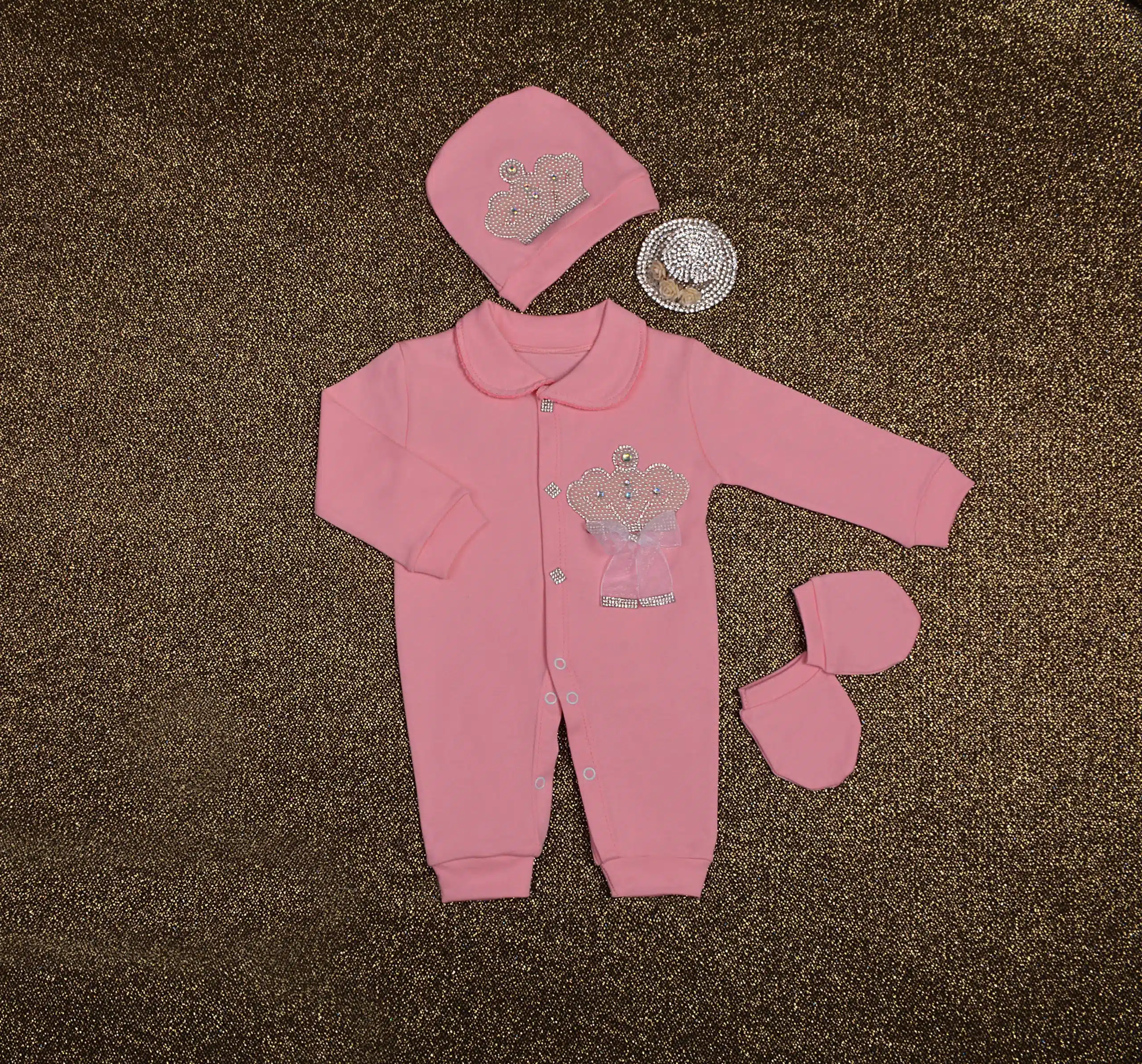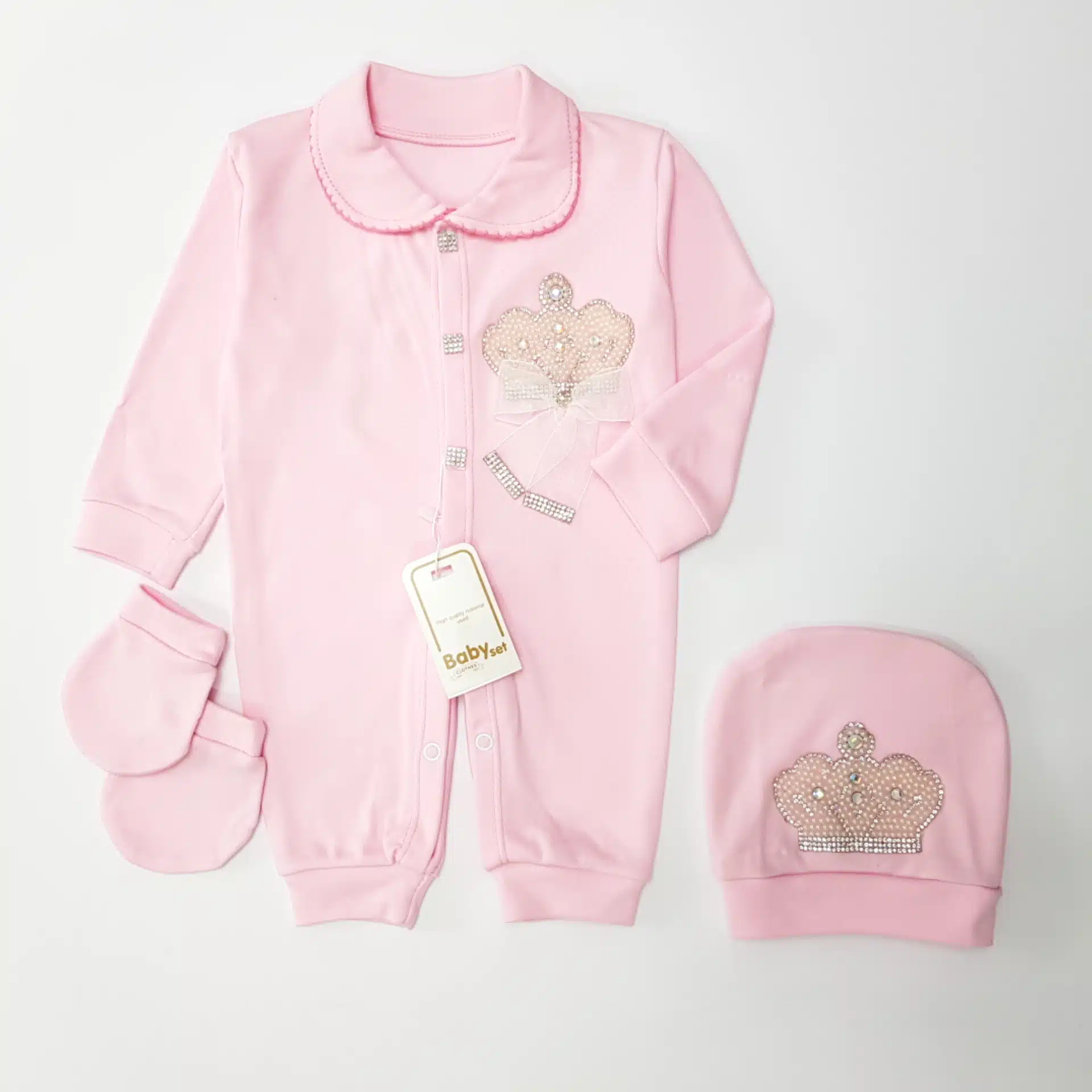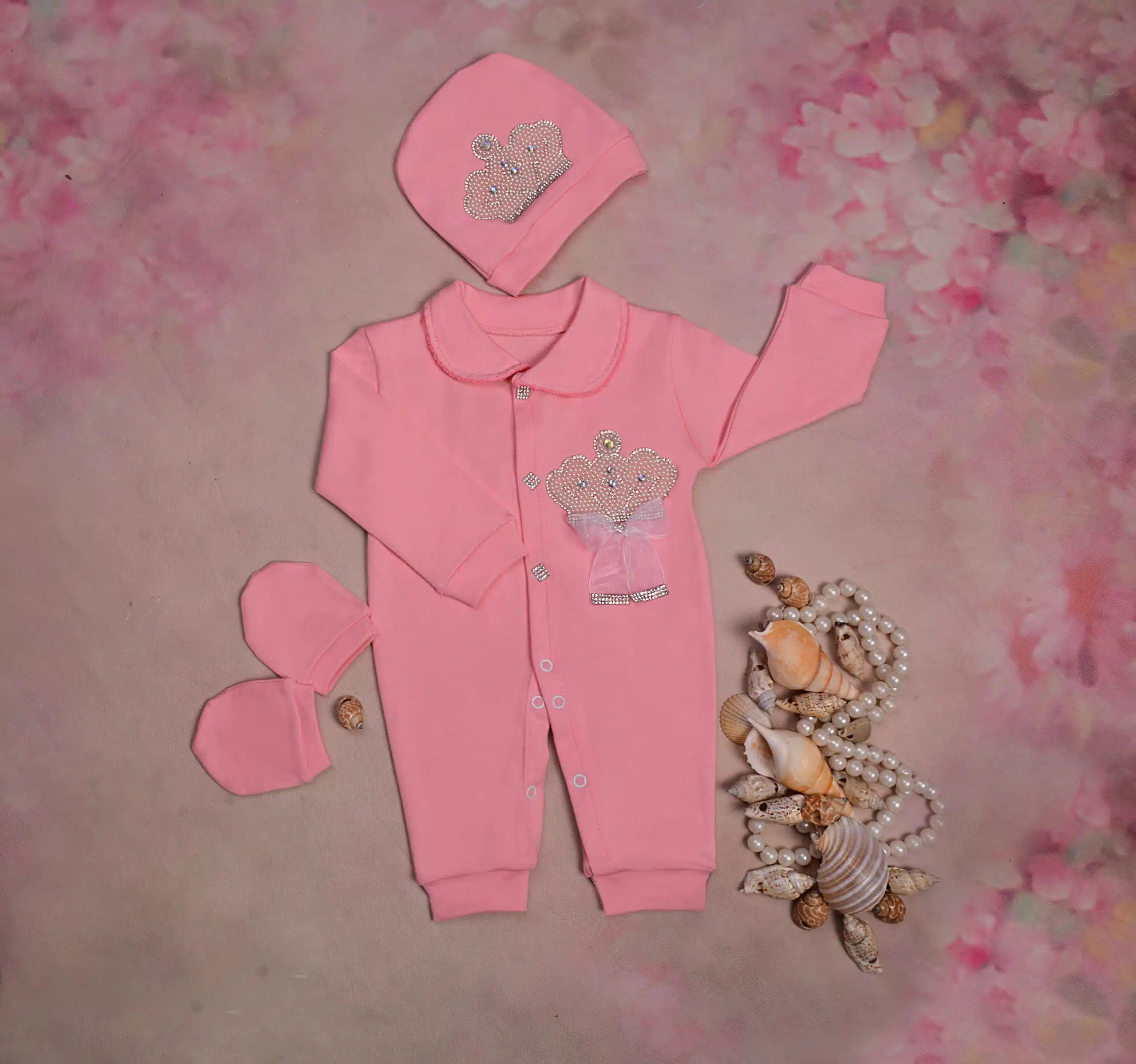 لازم به ذکره که وزن و جثه نوزادان خیلی باهم متفاوته ازین رو تو انتخاب سایز باید دقت بیشتری بخرج داده بشه. طرح تاج توی سرهمی ها خیلی طرفدار داره چون در عین سادگی و کلاسیک بودن خیلی زرق و برق داره و کاملا به چشم میاد. در این طرح از پارچه پلی پنبه رنگ شیری استفاده شده و دارای دو تیپ پسرونه و دخترونه می‌باشد که در یقه و نوع تاج و پاپیون ها متمایز می شوند؛ یقه دخترونه از نوع برگردون با دوخت دالبری (ژور) روی لبه کار طراحی شده ولی یقه پسرونه ساده انتخاب شده که پاپیون زیر یقه خودشو بیشتر نشون بده. پاپیون دخترونه از جنس حریر بهمراه نگین بوده که زیر تاج چسبیده میشه. پاپیون های پسرونه از جنس ساتن هستن که زیر تاج، زیر یقه و روی کلاه و همچنین دستکش ها با دو رنگ طوسی و سرمه ای عرضه می­شوند. نگین های روی دکمه ها هم جذابیت خاصی به این طرح بخشیده که محبوبیت این مدل را دوچندان کرده است.