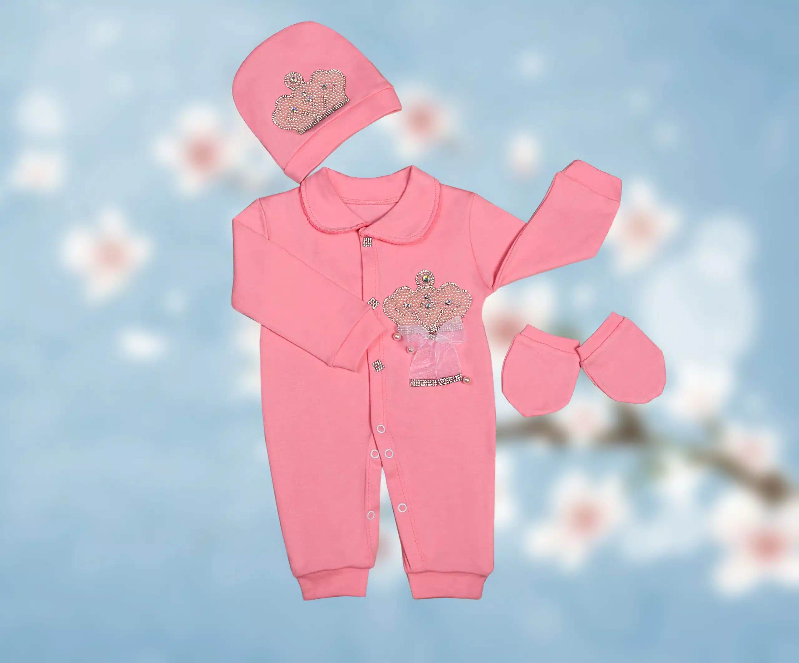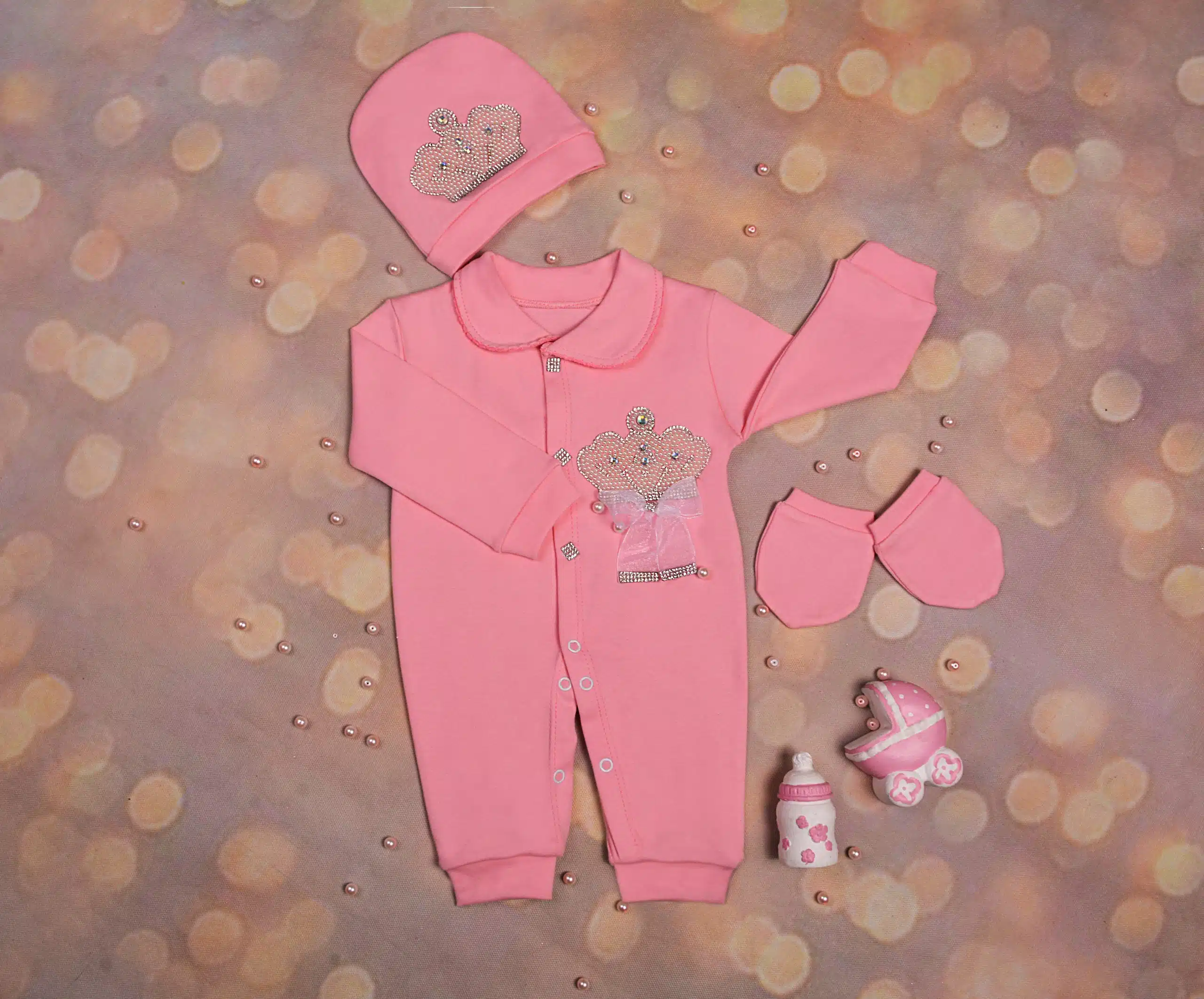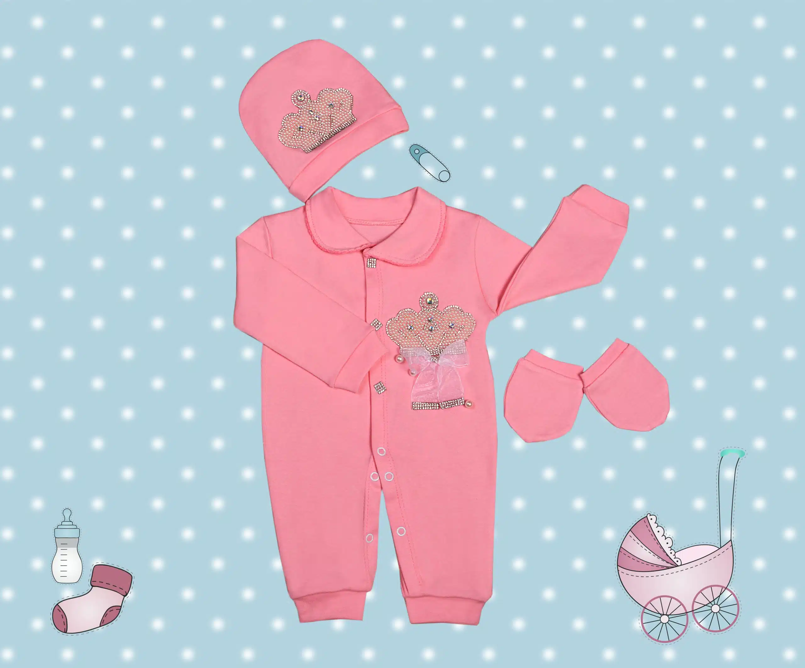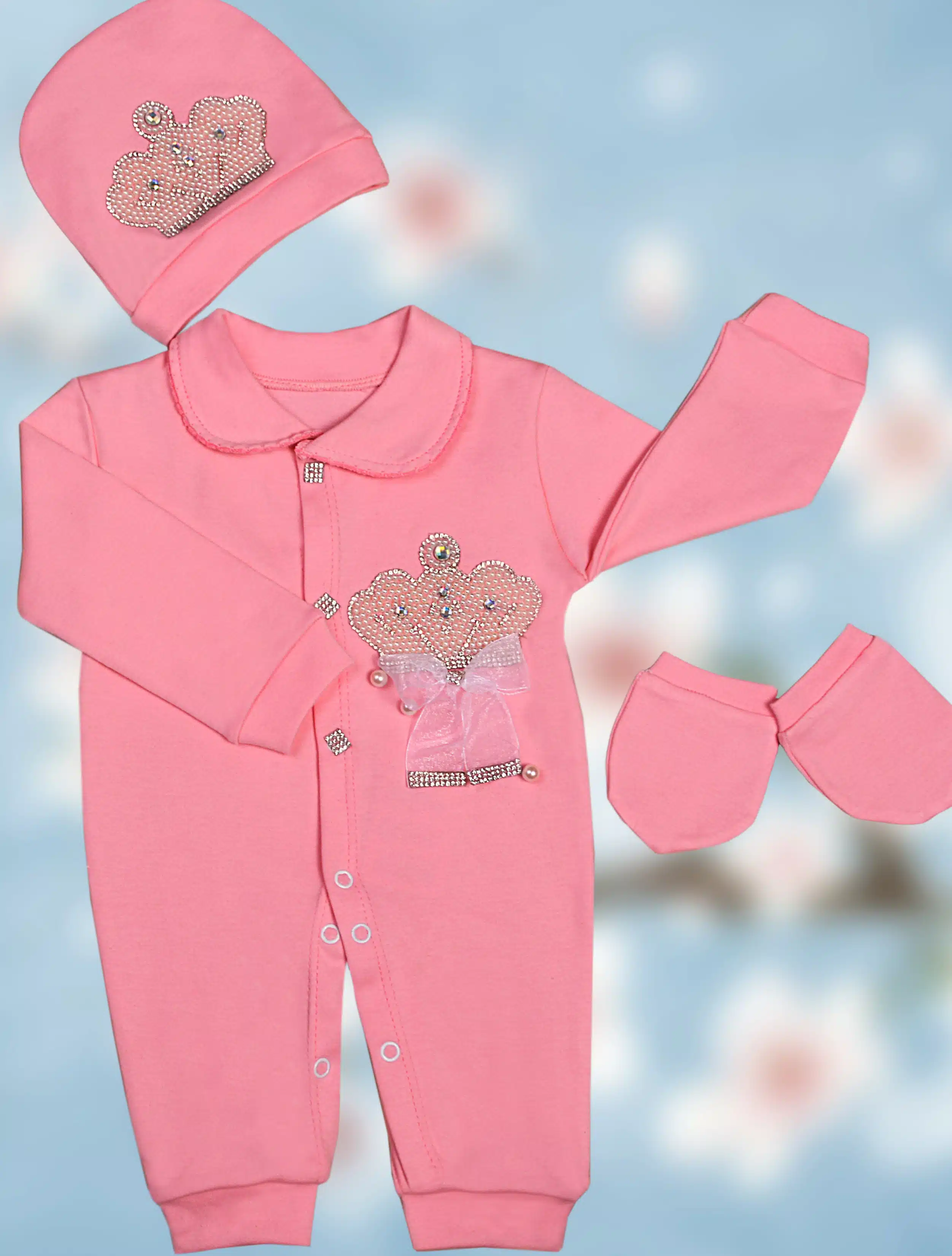 لازم به ذکره که وزن و جثه نوزادان خیلی باهم متفاوته ازین رو تو انتخاب سایز باید دقت بیشتری بخرج داده بشه. طرح تاج توی سرهمی ها خیلی طرفدار داره چون در عین سادگی و کلاسیک بودن خیلی زرق و برق داره و کاملا به چشم میاد. در این طرح از پارچه پلی پنبه رنگ شیری استفاده شده و دارای دو تیپ پسرونه و دخترونه می‌باشد که در یقه و نوع تاج و پاپیون ها متمایز می شوند؛ یقه دخترونه از نوع برگردون با دوخت دالبری (ژور) روی لبه کار طراحی شده ولی یقه پسرونه ساده انتخاب شده که پاپیون زیر یقه خودشو بیشتر نشون بده. پاپیون دخترونه از جنس حریر بهمراه نگین بوده که زیر تاج چسبیده میشه. پاپیون های پسرونه از جنس ساتن هستن که زیر تاج، زیر یقه و روی کلاه و همچنین دستکش ها با دو رنگ طوسی و سرمه ای عرضه می­شوند. نگین های روی دکمه ها هم جذابیت خاصی به این طرح بخشیده که محبوبیت این مدل را دوچندان کرده است.