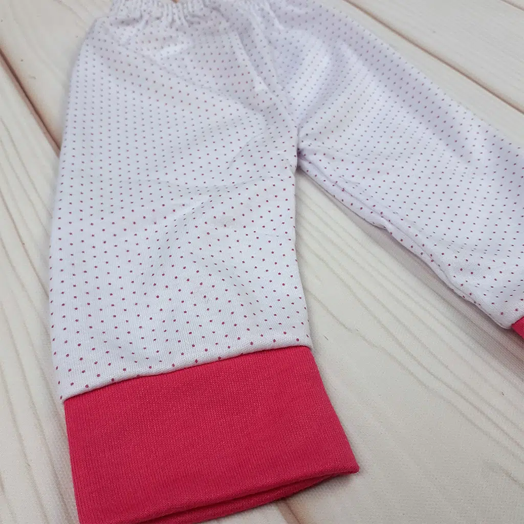 طرح سفید خالدار ظاهر شلوار را شیک و کودکانه کرده و ساق‌های صورتی جذابیت بیشتری به آن داده است.