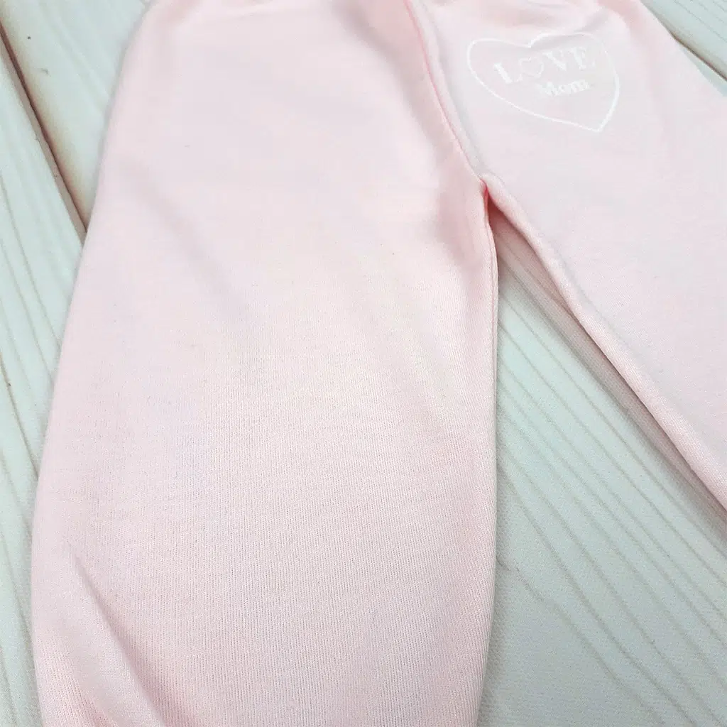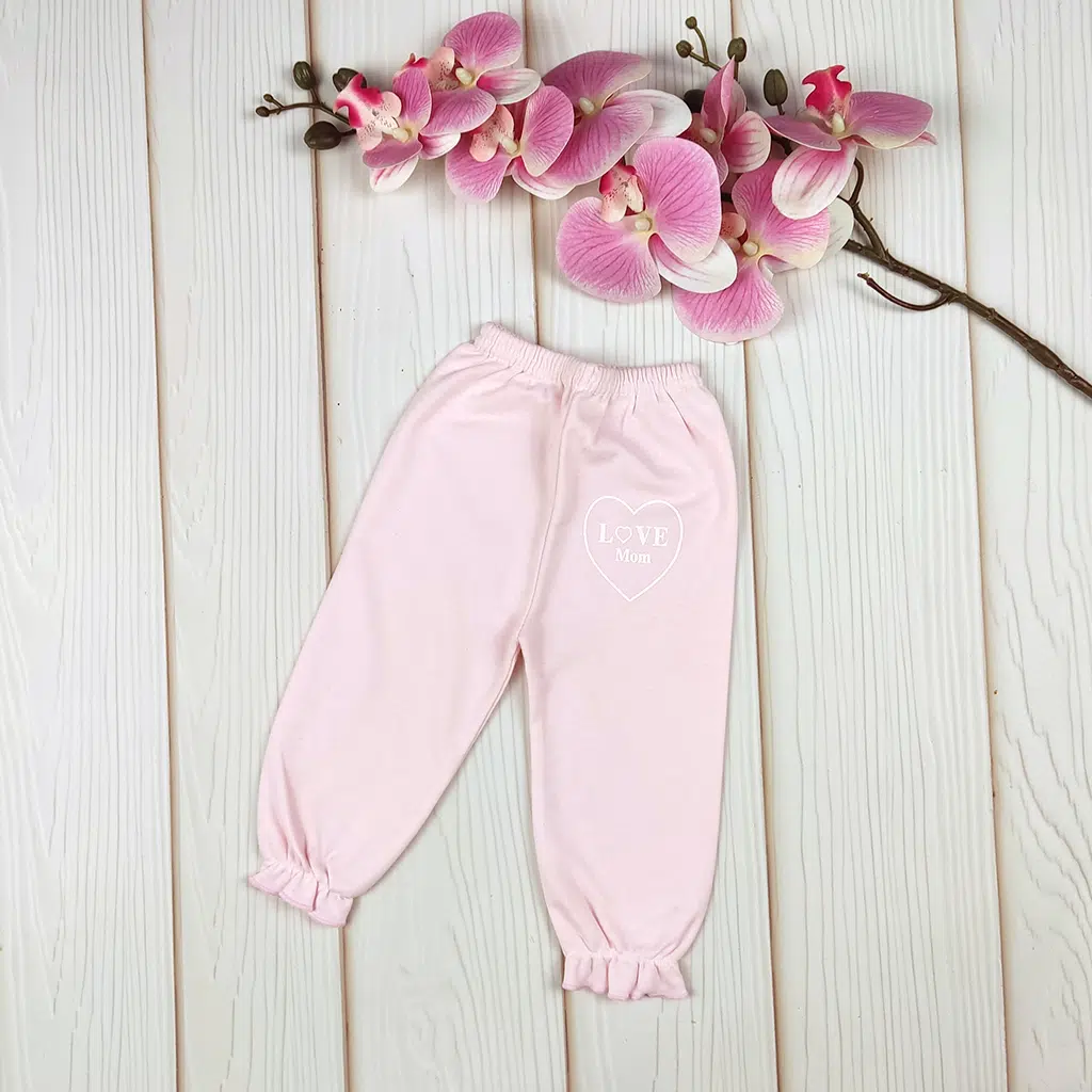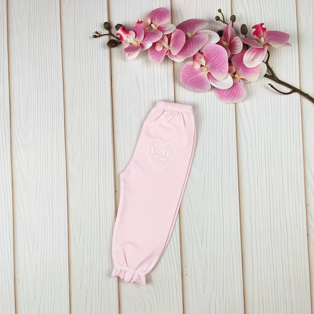 رنگ صورتی ملایم همراه با چاپ قلبی «Love Mom» ظاهر شلوار را شیرین و کودکانه می‌کند.