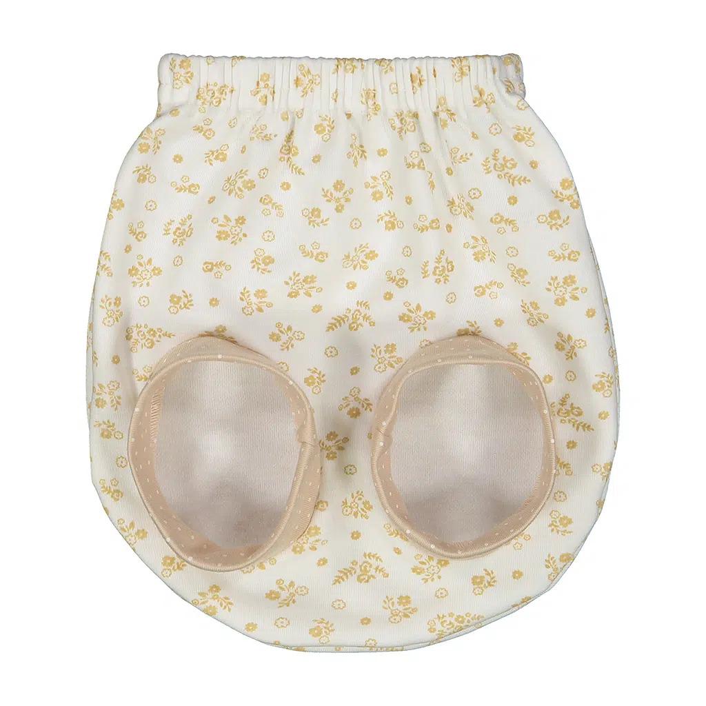 طرح گلریز ملایم با ترکیب رنگ کرم و سفید ترند سال، ظاهر دخترانه و بسیار دلنشینی به این شورت داده است. کش کمر نرم و استاندارد، بدون ایجاد فشار، راحتی کامل را تضمین میکند و قسمت توری بخش عینکی نیز تهویه هوا را بهتر کرده و باعث میشود نوزاد کمتر احساس گرما یا رطوبت کند.