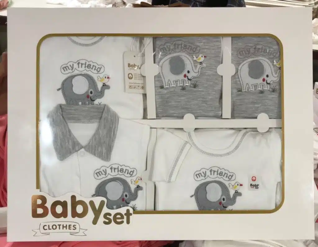 اینجا میخوام چند مورد از تفاوت های مدل های مختلف این محصولات رو توضیح بدم ولی قبلش اینو بگم که طرح های تاج و گلدوزیمون که جمعا حدود ۲۰ طرح میشه تحت عنوان babyset و طرح های گلدوزی و چاپیمون تحت عنوان babybox نام گذاری شدن که هم برای خودمون و هم برای فروشگاه ها و مشتری ها برای سفارش دادن راحتی بیشتری ایجاد کنیم. مساله اول جنس پارچشونه؛ ۱۹ تکه طرح های بیلی ست پارچه ضخیم تر و لطیف تر و با دوام ترس نسبت به بیبی باکس دارن ولی خب تو پرانتز باید بگم همه پارچه های تولیدی ما از لحاظ دوام و رنگ و ضو حساسیت بودن کاملا ضمانت میشن. میله بعدی نوع جعبه و نحوه بسته بندیه. جعبه babyset هم لحاظ طول و عرض و از لحاظ عمق حدود دوبرابر بزرگتره و داخل جعبه توسط دیواره هایی به بخش های کوچکتر تقسیم شده. می‌دونم خیلی مشتاق هستید که بدونید تو این جعبه جادویی چی میگذره و چه لباس هایی توشه اگه یکم صبور باشید بصورت مجزا توضیح میدم؛ اولش بهتره از ۸ تکه اصلی براتون بگم که عبارت میشه از: